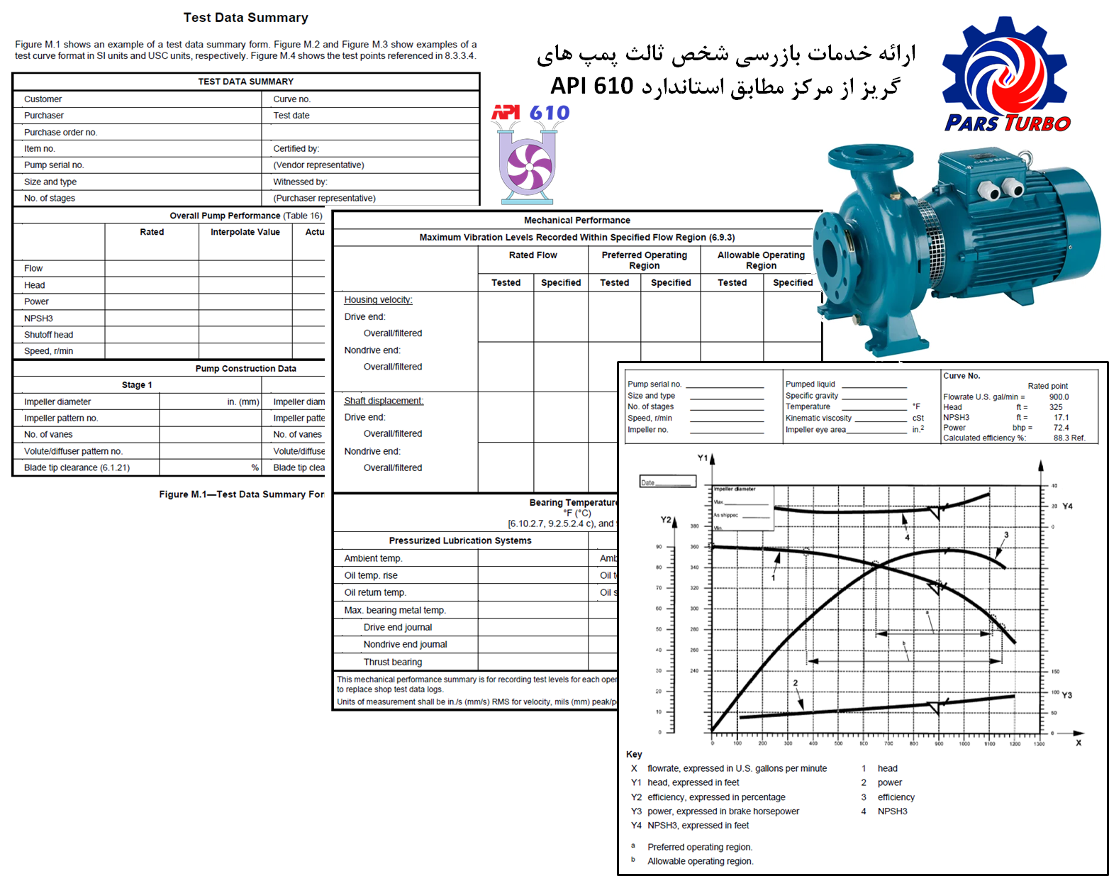 ارتعاش: در هر آزمون عملکردی پمپ گریز از مرکز لازم است که ارتعاش پوسته یاتاقانهای پمپ در دبی های مختلف اندازه گیری و ثبت شود. در مابین یاتاقانهای پمپ بایستی ارتعاش پوسته یا کاور یاتاقان در جهت های عمودی و افقی اندازه گیری شود و برای پوسته یاتاقان کف گرد در جهت محوری اندازه گیری گردد.